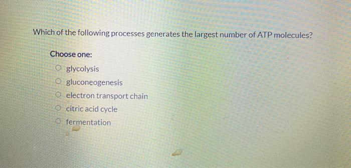 Which of the following generates the largest amount of ATP. From one molecule of glucose which process generates the largest amount of ATP. The electron transport chain.